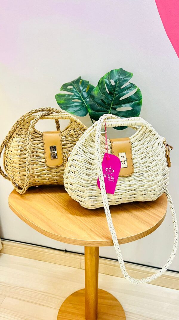 Características da Bolsa Cub de Tecelagem Palha detalhes em metal